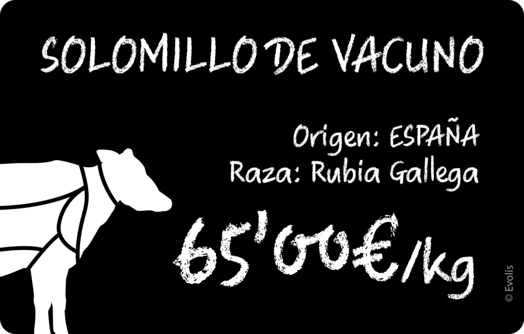 Los carteles precios carnicería son personalizables con toda la información requerida: precio por kg o unidad, alérgenos, origen, ingredientes para la sección de gastronomía.