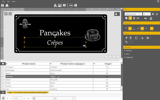 El software Edikio Guest incluye una biblioteca de más de 200 plantillas de etiquetas y más de 350 pictogramas para personalizar sus etiquetas de bufé y otras tarjetas.