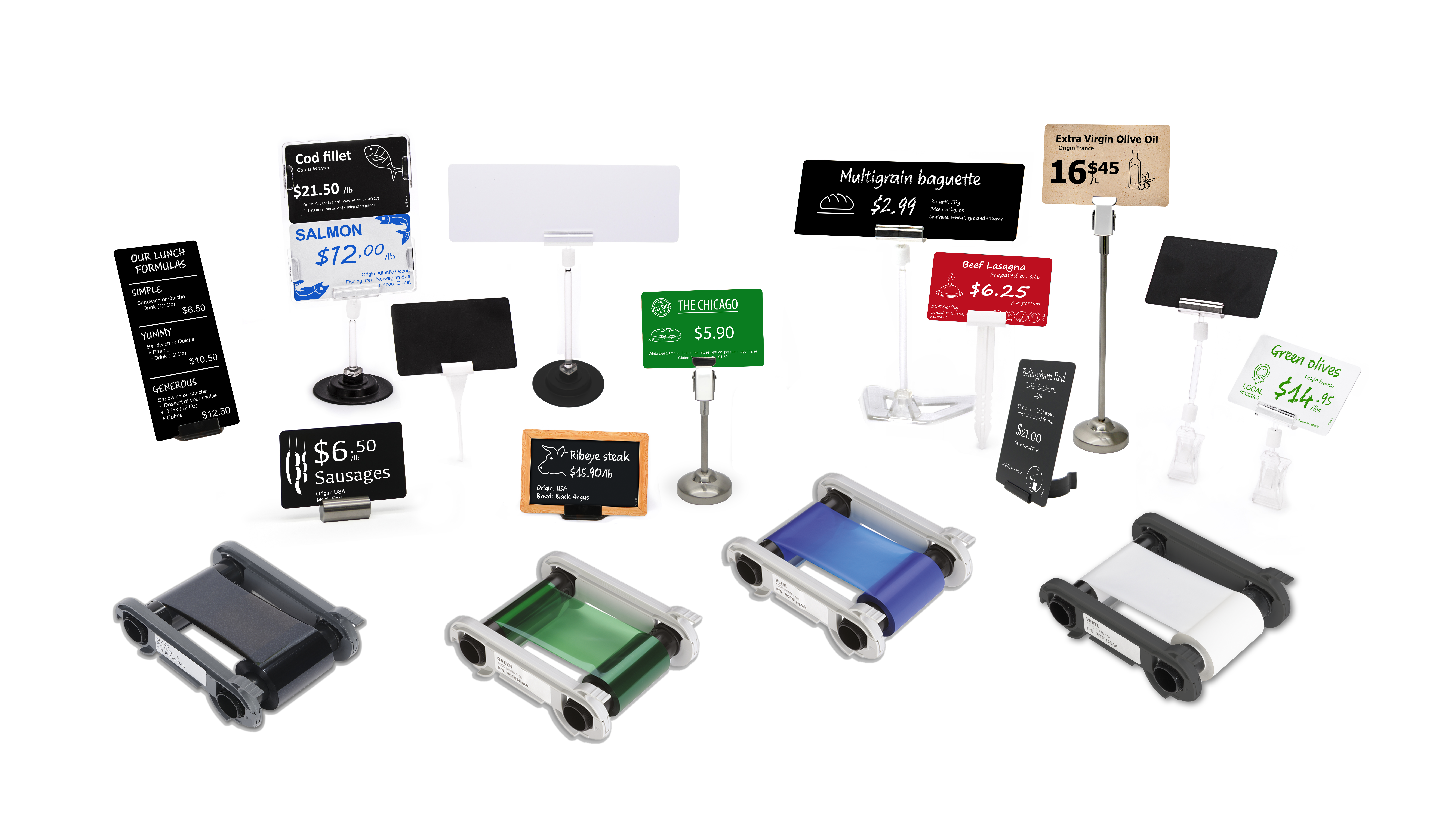 Así podrá crear etiquetas únicas y perfectamente adaptadas a la imagen de su establecimiento, Edikio Price Tag ofrece una amplia gama de accesorios y consumibles. Cintas de impresión de colores, tarjetas de colores o de materiales específicos (PVC, PLA/Madera, PETG reciclado), formatos de tarjeta de crédito o largos, soportes cosidos o colocados: hemos pensado en todo para que pueda personalizar sus expositores según sus necesidades y deseos. Añada carácter a su presentación, valorice sus productos y aumente su atractivo con facilidad.