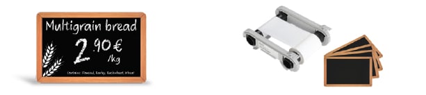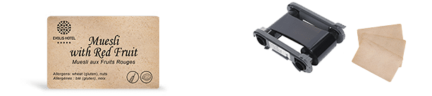 Disponibles en formato estándar, las tarjetas PLA/BOIS pueden imprimirse con la cinta negra «Black RMS RCT095NAA» para Access y «Black RMS RCT094NAA» para Flex.