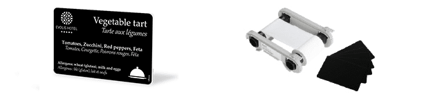 - Tarjetas PETG recicladas Con su impresión monocroma blanca sobre un fondo negro mate, tienen el mismo aspecto que las tarjetas de PVC y son igual de profesionales. Son fáciles de limpiar y lo bastante resistentes para soportar una manipulación frecuente. Además, están diseñadas para la industria alimentaria.